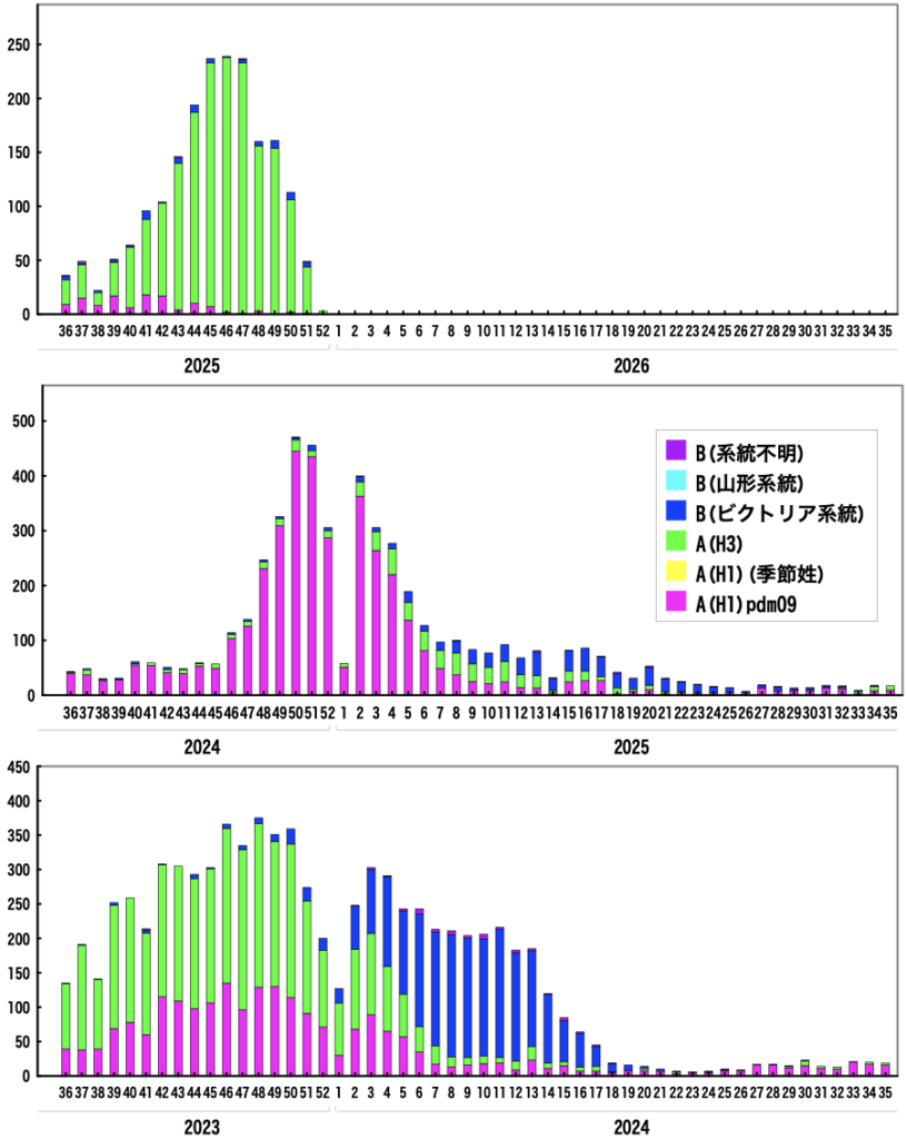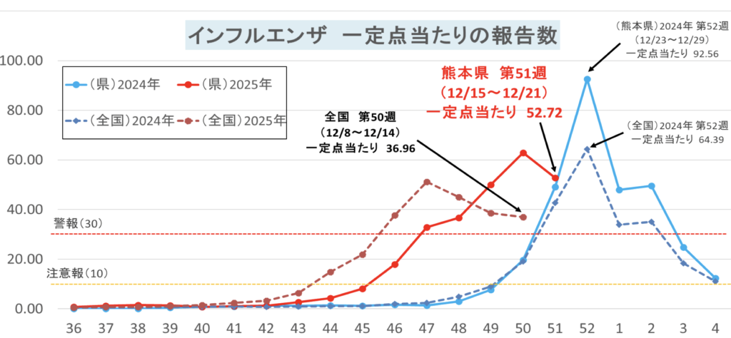 インフルエンザの流行は、少なくとも熊本では、意外としつこく続いているようです。定点あたり報告数で見ると、全国的には第47週(11/17~23)をピークに、減少に転じて... -