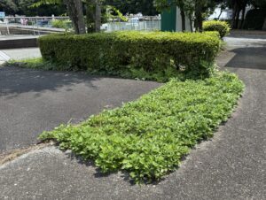 クリニックの駐車場の縁に、芝生を植えている(植えていた)、長方形の区画が2つあります。