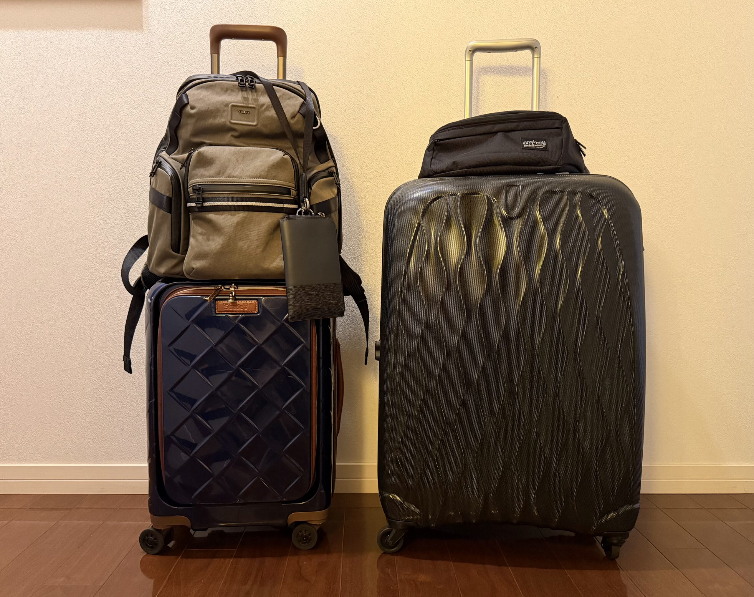 スーツケースは中型と小型の2個。さらにリュック、ウエストバッグ、スマホストラップと、まあ重装備です。