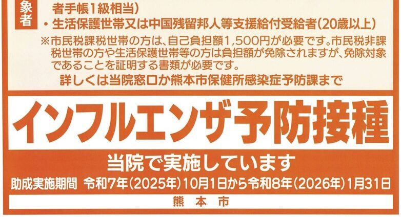 (写真は、熊本市のインフルエンザ予防接種(定期接種)実施医療機関用ポスター。定期接種は10月から)