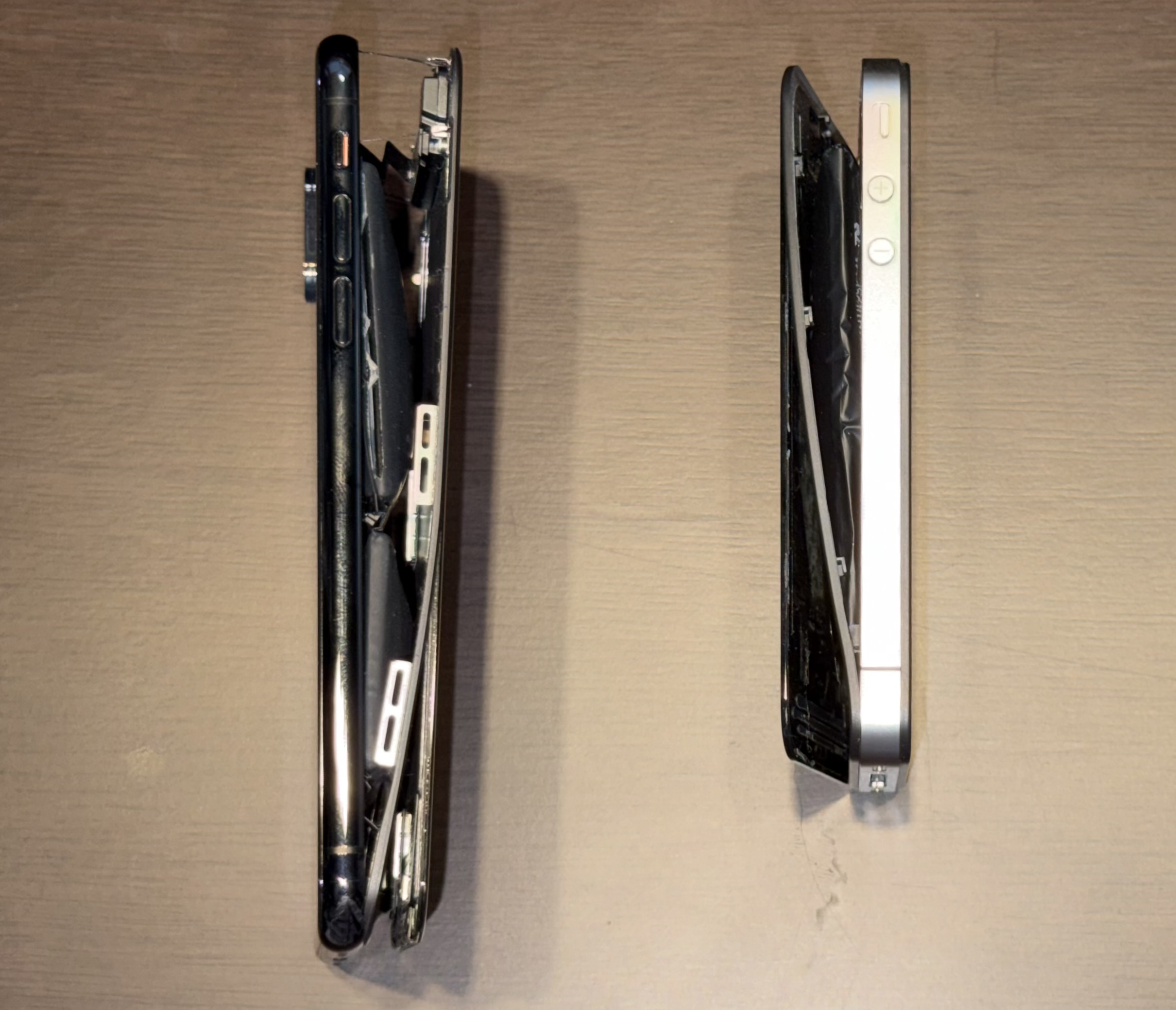 (写真は、見事に膨らんだ「iPhone X」(左)と「iPhone 4」(右))