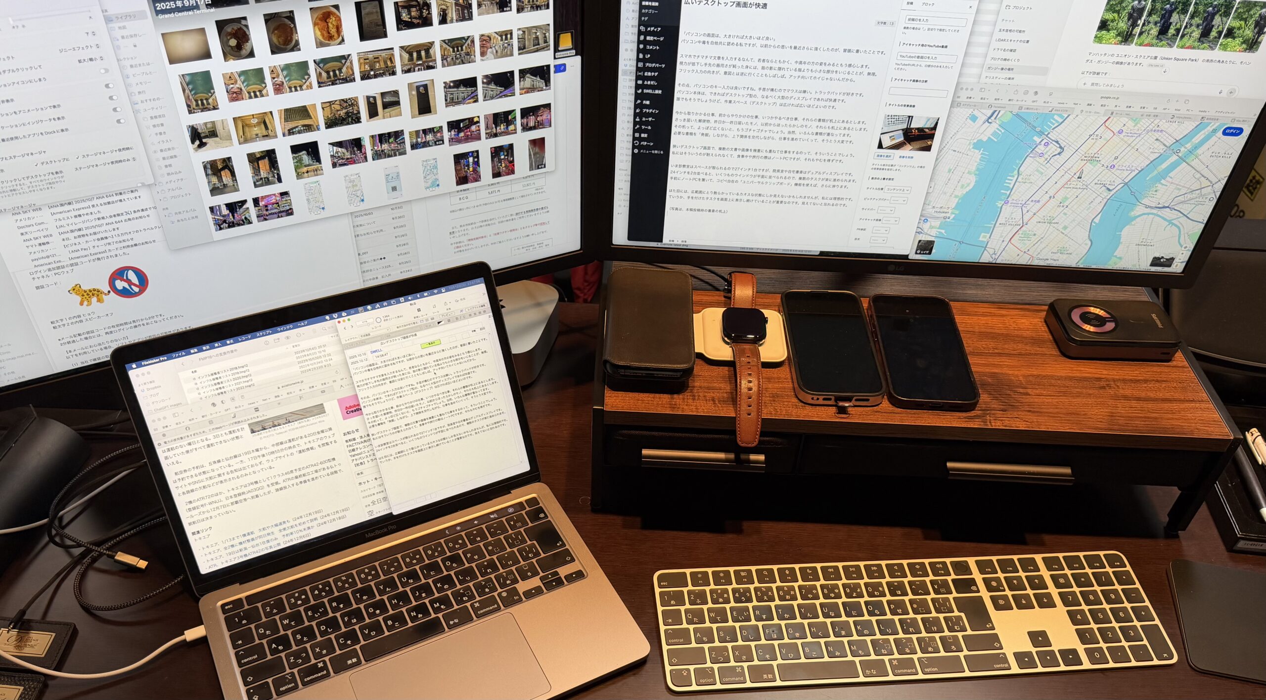 手前にMacBookを置いて、コピペ自在の「ユニバーサルクリップボード」機能を使えば、さらに捗ります。