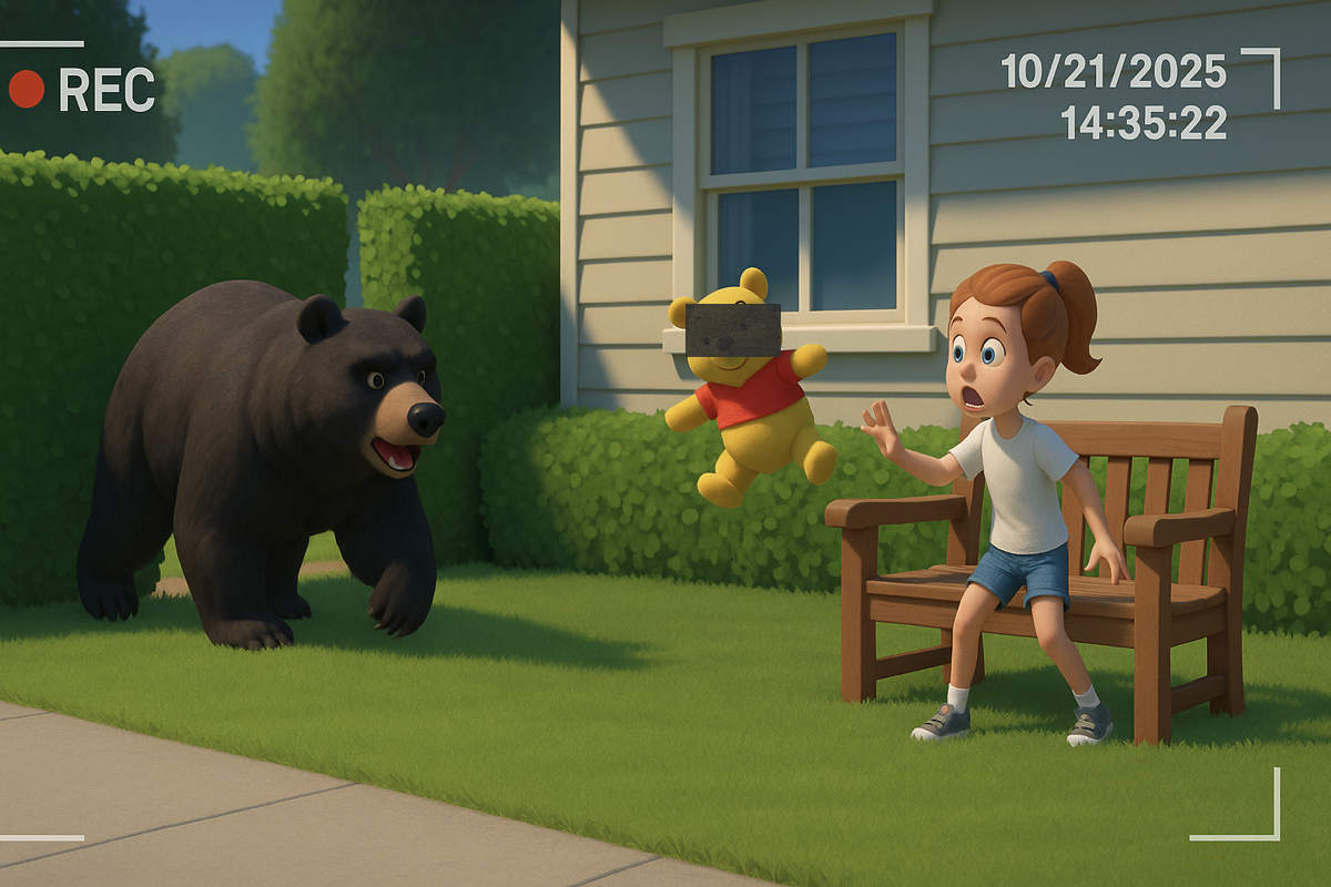(写真は、「クマに○ーさんを投げて撃退する瞬間の防犯カメラ画像」というお題のChatGPT画像)
