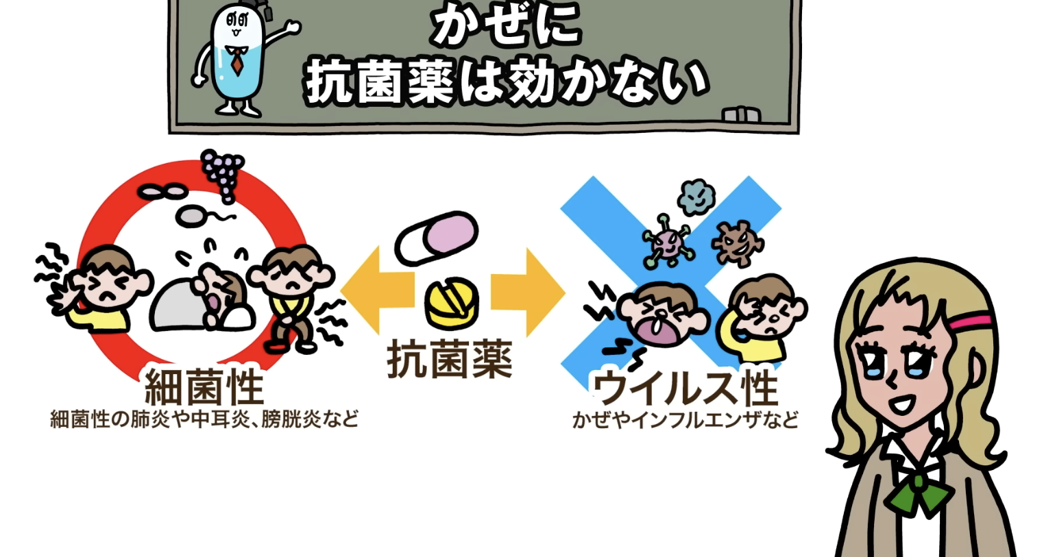 (写真は、AMR臨床リファレンスセンターの啓蒙動画「かぜに抗菌薬 効かへんで!」の一場面)