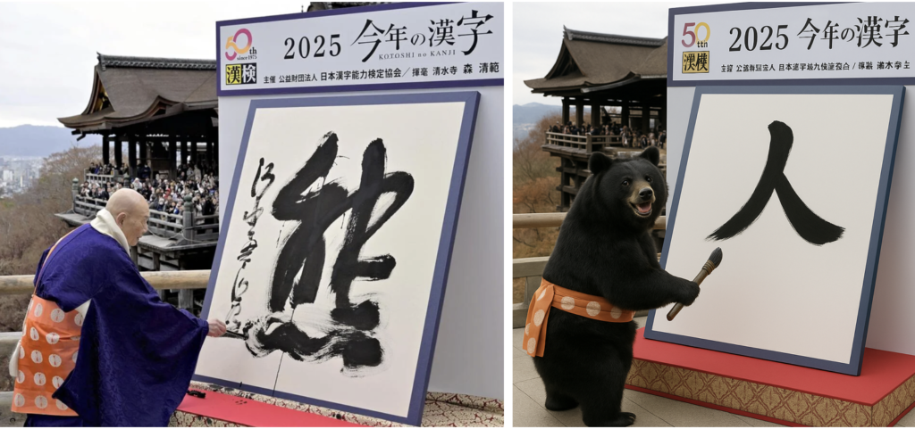(写真は、清水寺の森清範貫主による揮毫と、清水寺のツキノワグマによる揮毫(自作生成画像))