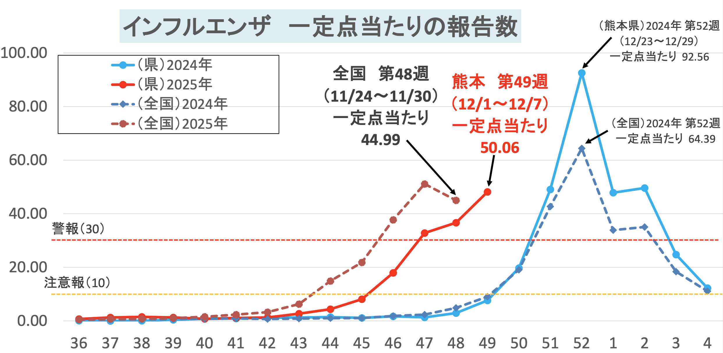 一方で、今期は全国より2週遅れで流行してきた熊本県は、第49週(12/1~7)が今季の最多報告数です。
