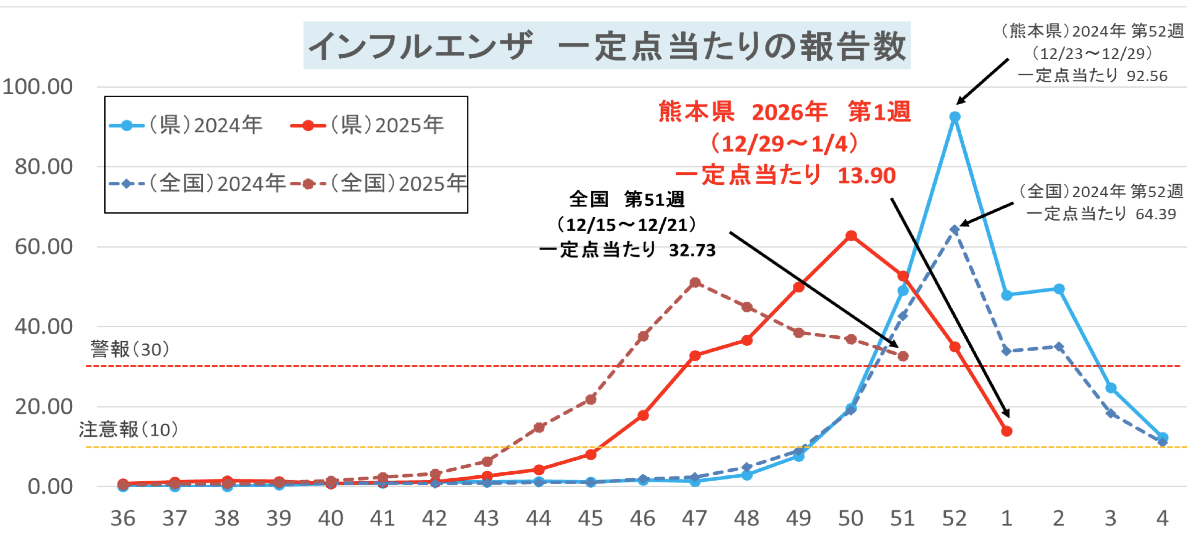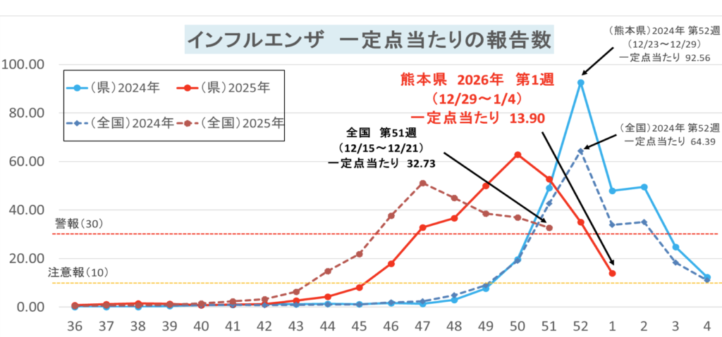 インフルエンザは、熊本県の定点あたり報告数で見る限りでは、確実に減っています。