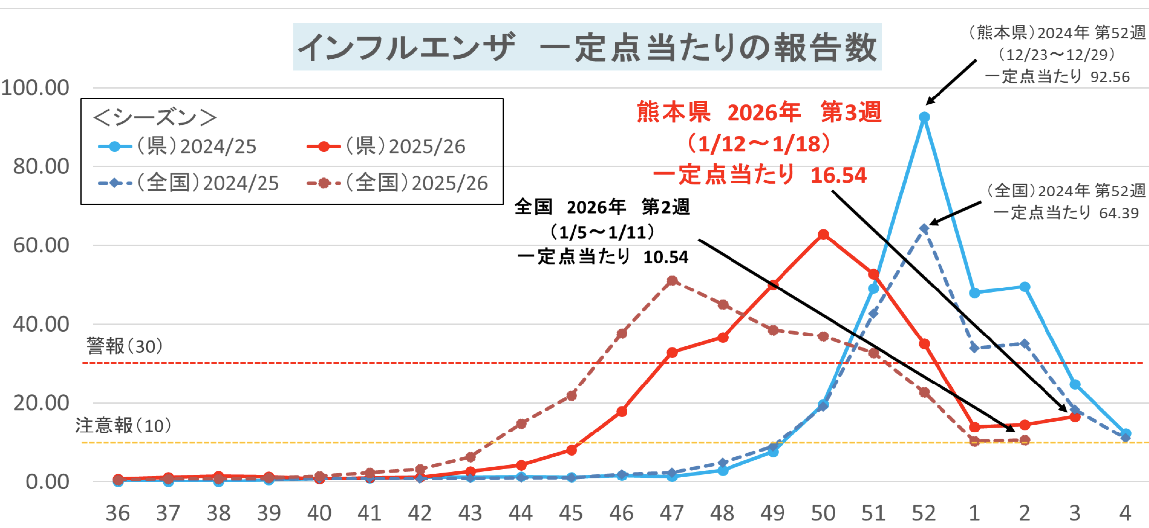 第1週から第3週(1/12-18)の報告数は、13.90、14.54、16.54と、むしろ若干増えているように見えます。