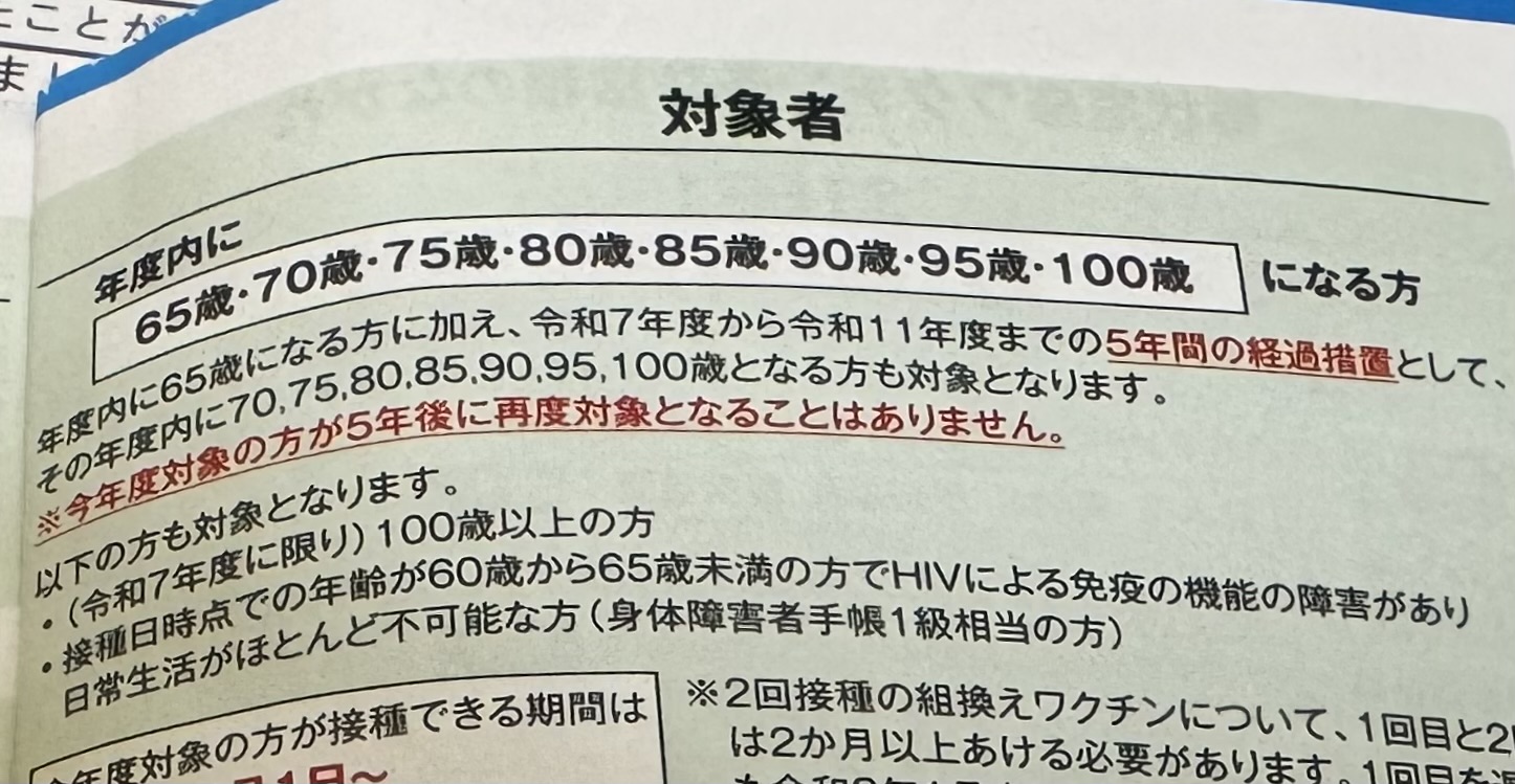 今年度の接種対象者は、今年度65,70,75,80,85,90,95歳になる方、および、100歳以上になる方です。
