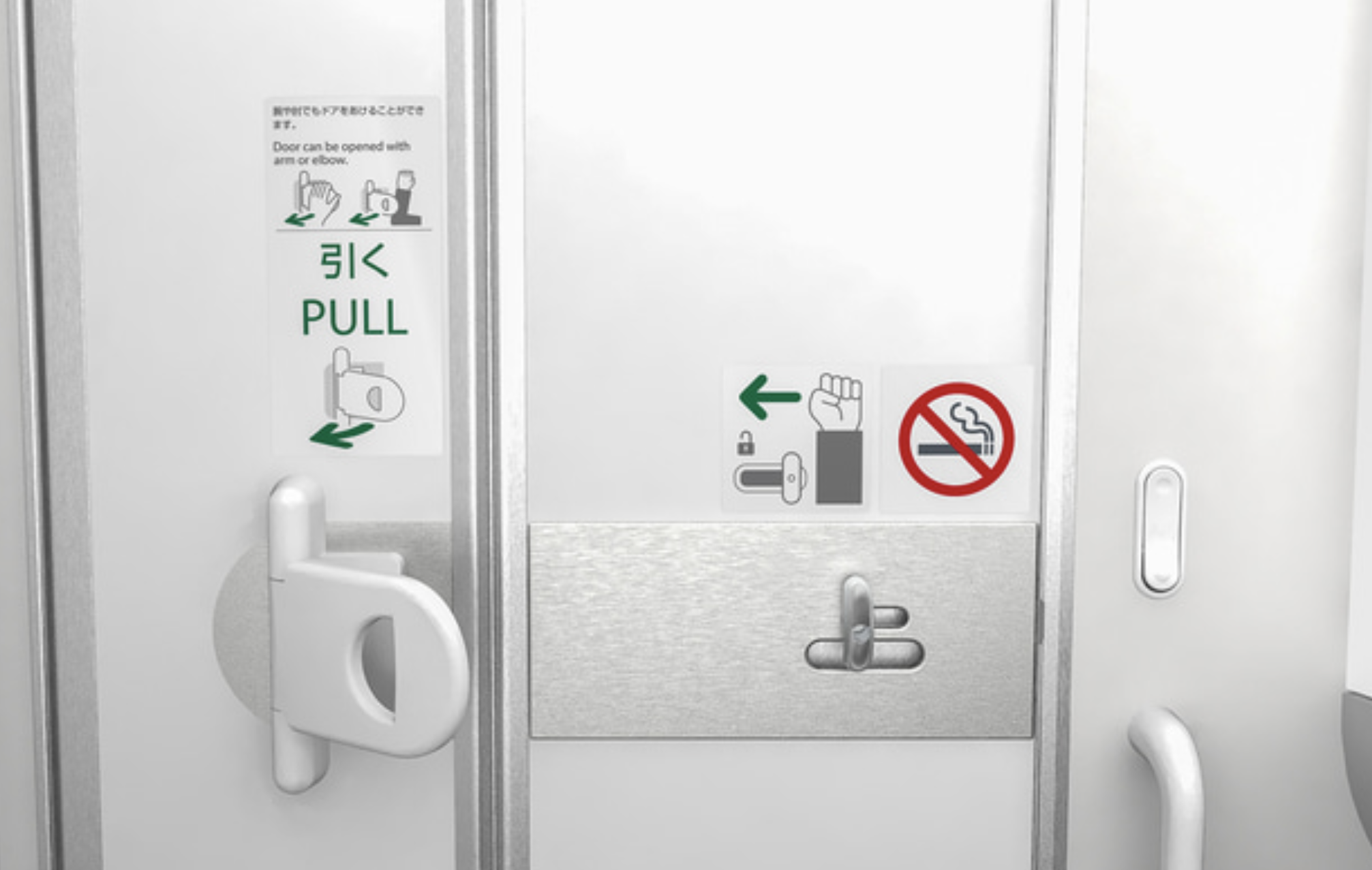 (写真は、ANAの一部機種に購入された、腕でロック解除して開けられるトイレドア)