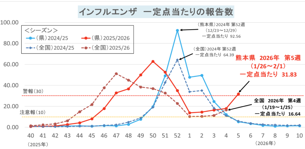 熊本県の定点あたり報告数は、今年に入って毎週ジリジリと増えて来ましたが、ここに来て急増です。