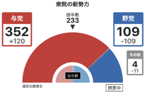 自民党は、戦後初めて議席が単独で衆議院全体の3分の2を上回るという「歴史的圧勝」を成し遂げました。