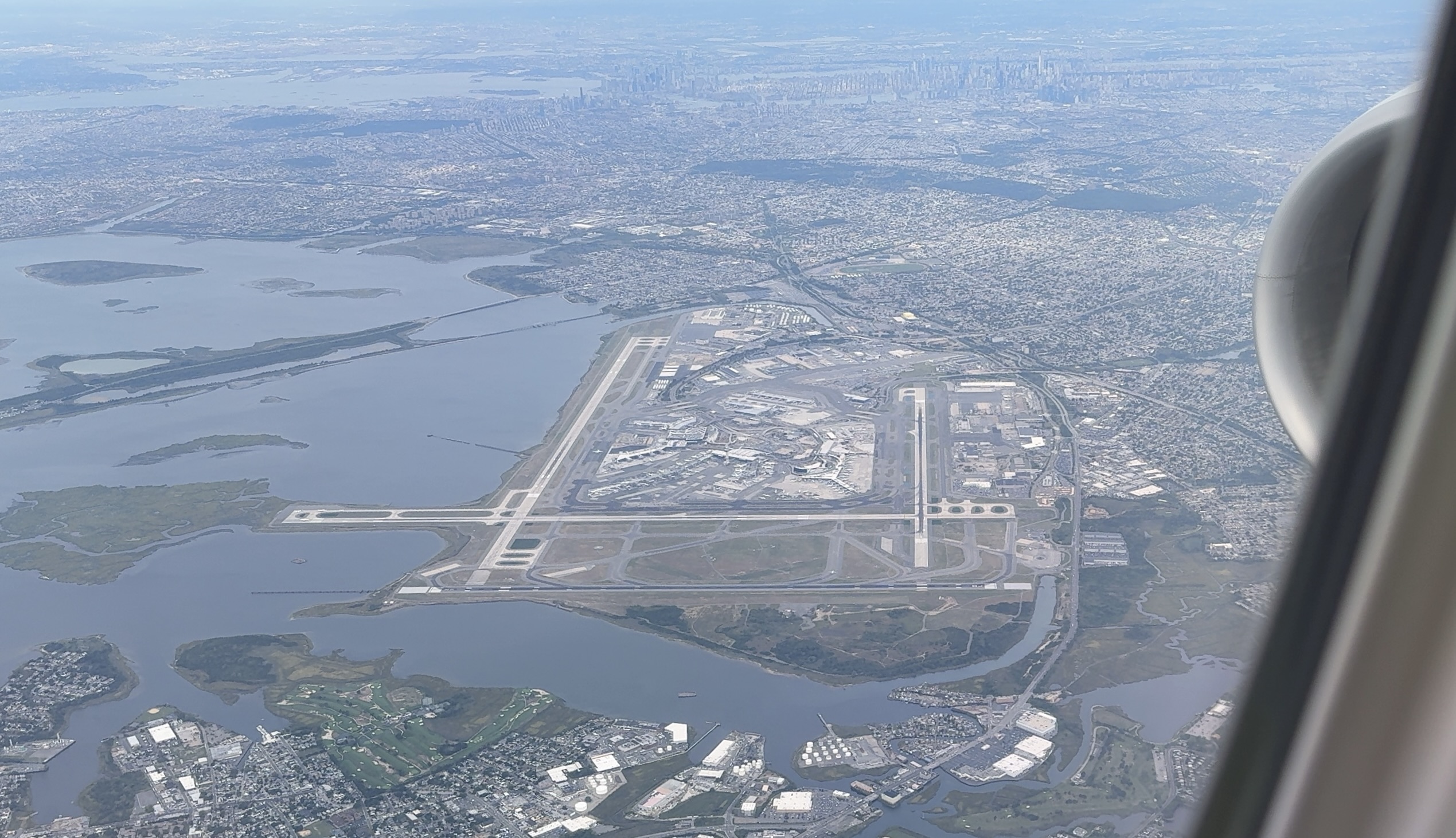 (写真は、昨年9月、着陸前にロングビーチ上空あたりから撮影したJFK空港。彼方にマンハッタンが見える)