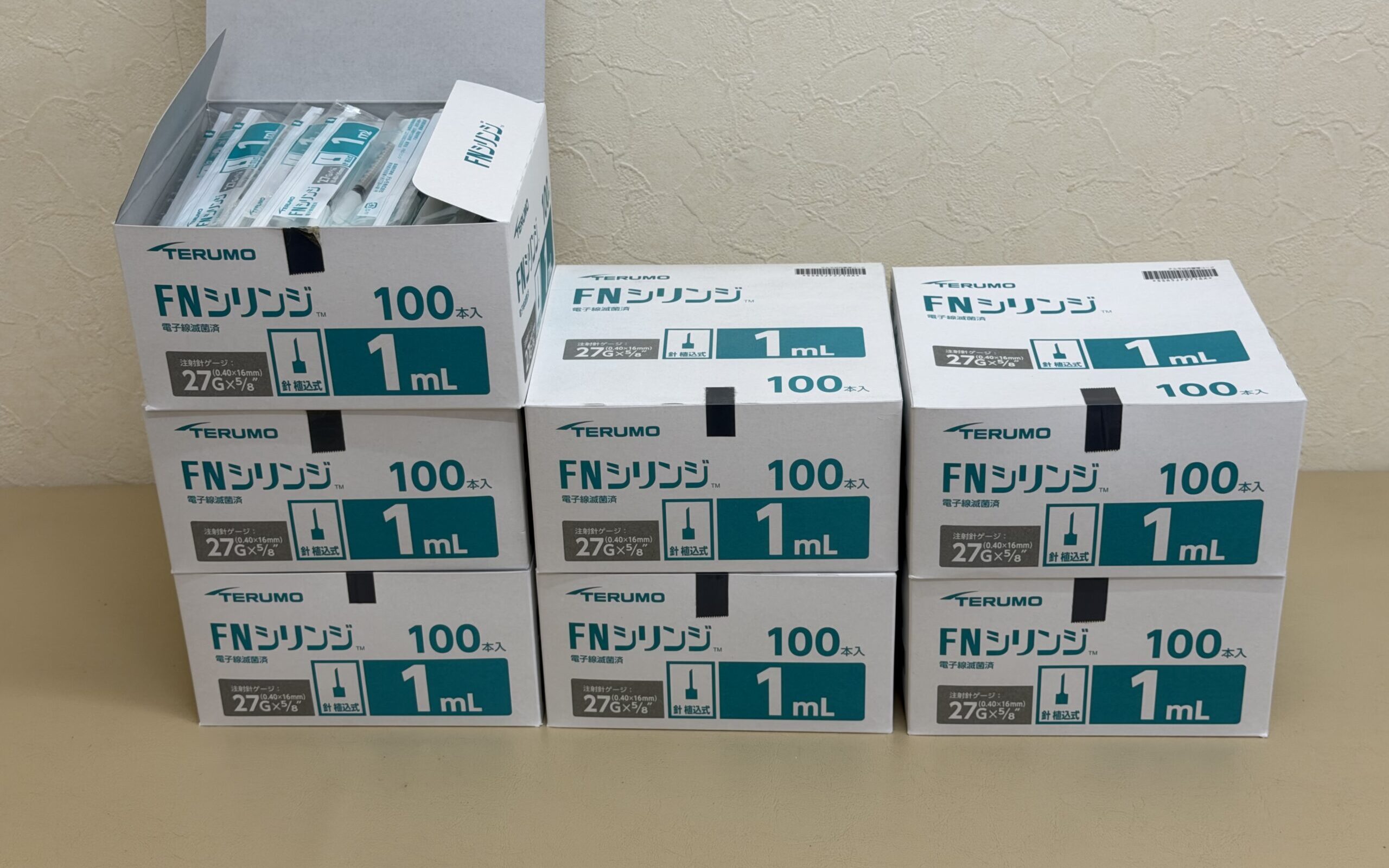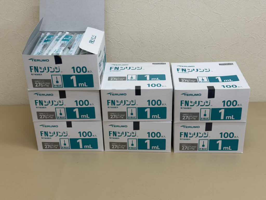 (写真は、当院の本日時点での「テルモ FNシリンジ1ml(27G針, 植込式)」の在庫)