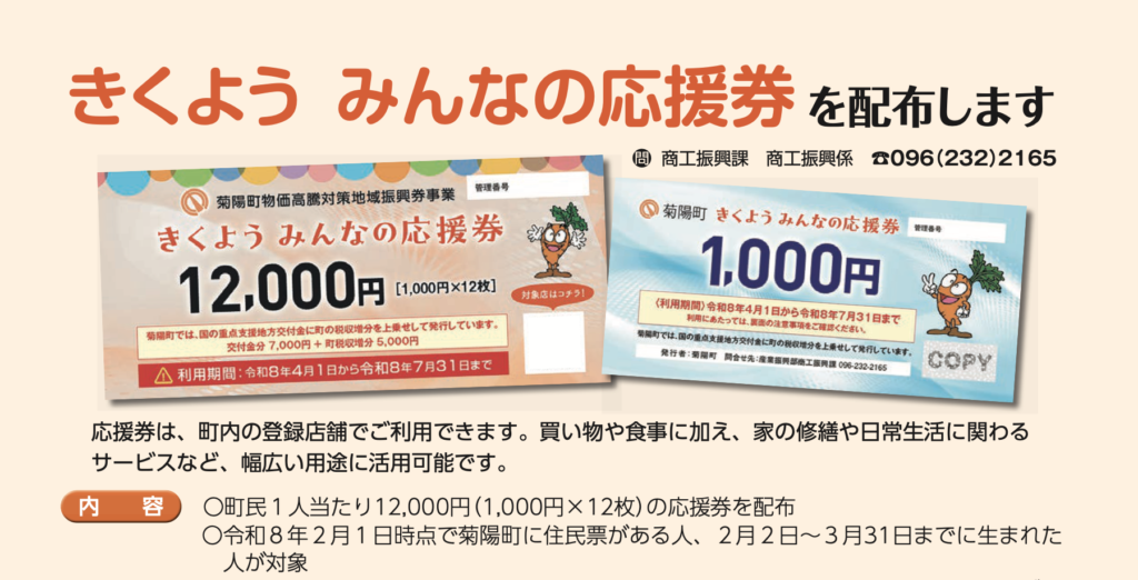 (写真は、菊陽町のサイトより「きくよう みんなの応援券」の広報)