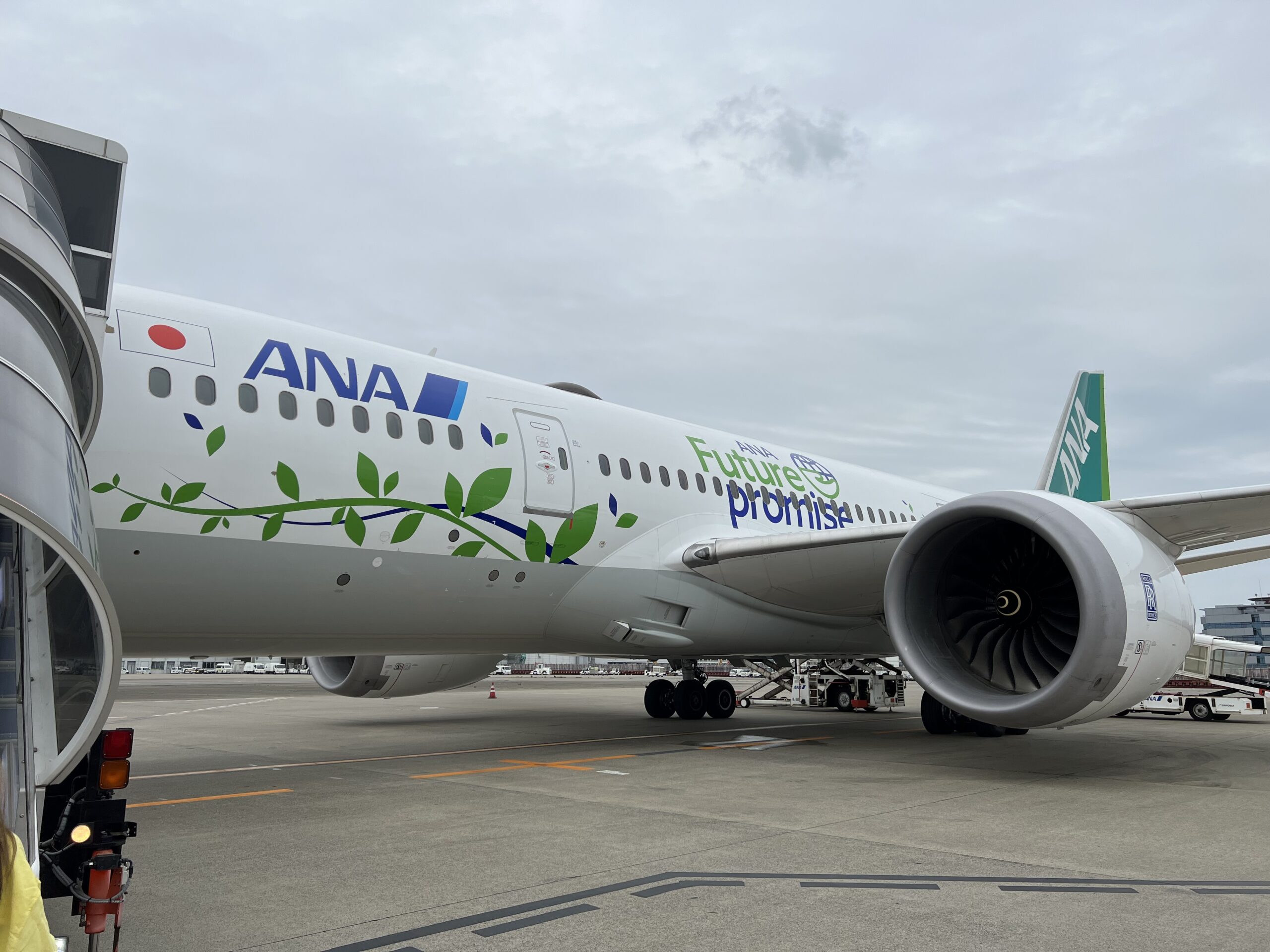 ANAの本来は青を基調とする塗装が、緑です。緑の葉っぱも生えています。